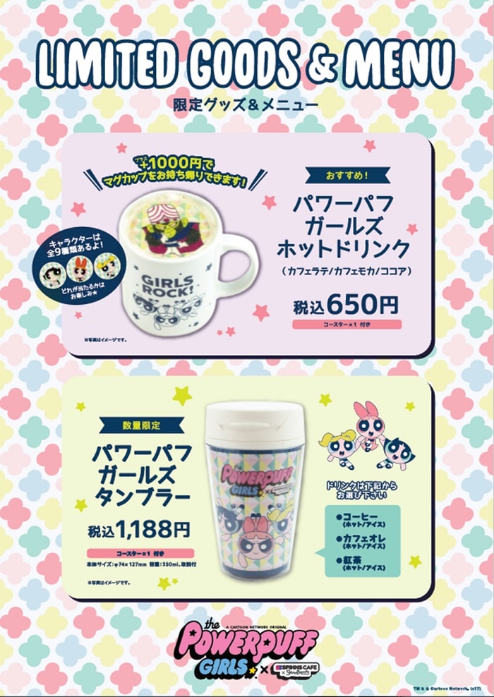 かわいいキャラクターのイラストが乗ったパワーパフ ガールズホットドリンクはドリンク代650円に+1000円でオリジナルデザインのマグカップがお持ち帰り頂けます!