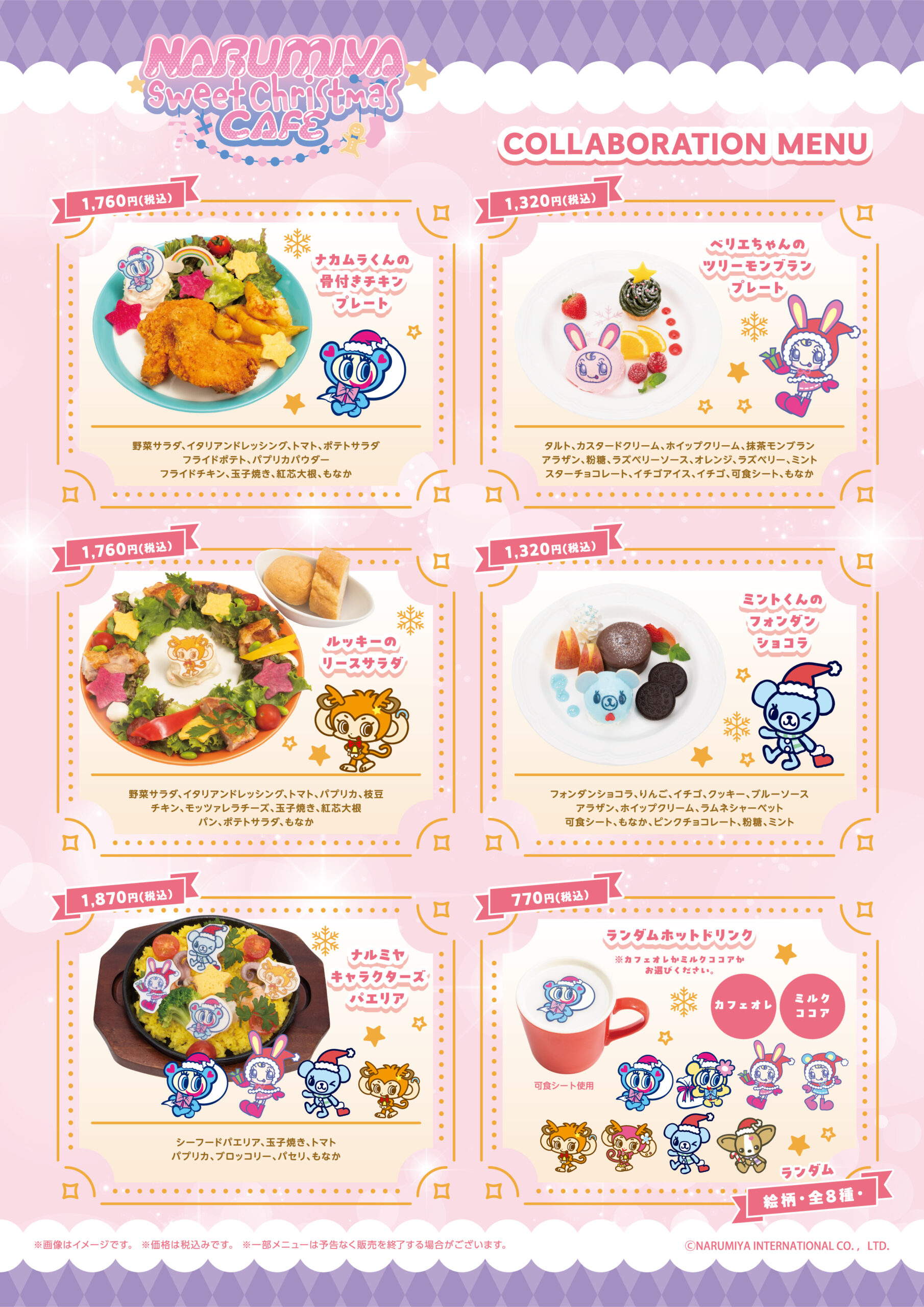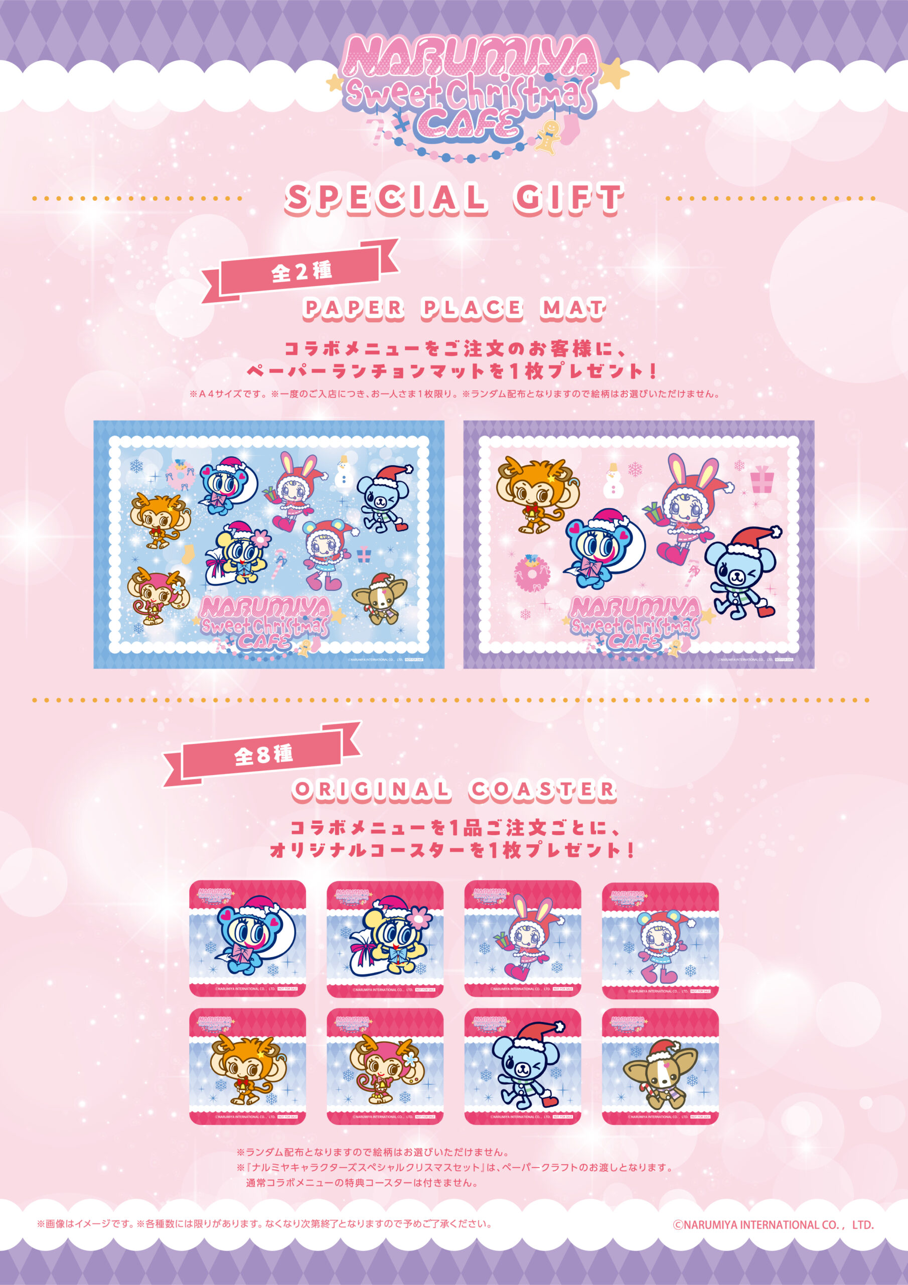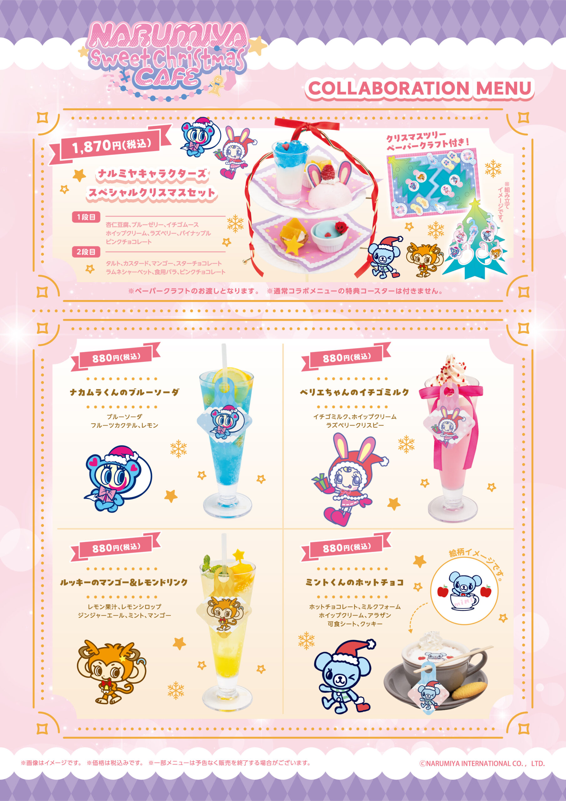※「ナルミヤキャラクターズスペシャルクリスマスセット」はペーパークラフトのお渡しとなります。通常コラボメニューの特典コースターは付きません。
