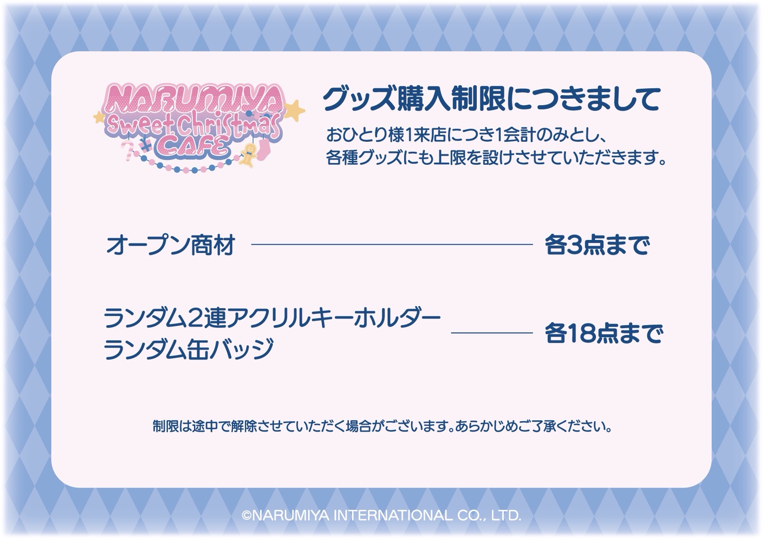 より多くのお客様にご購入いただけるようオリジナルアイテムに購入制限を設けさせていただきます。