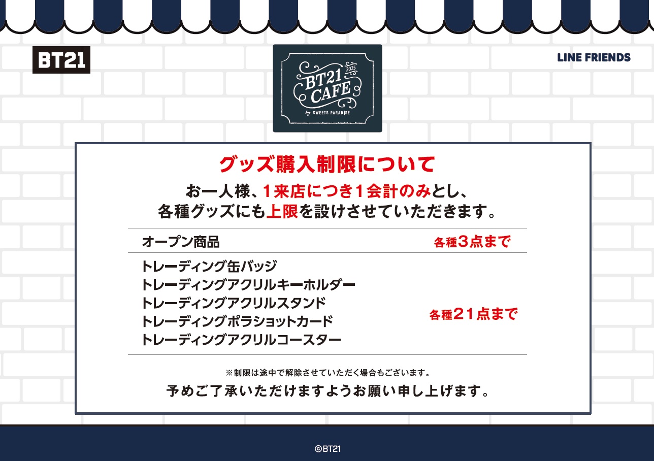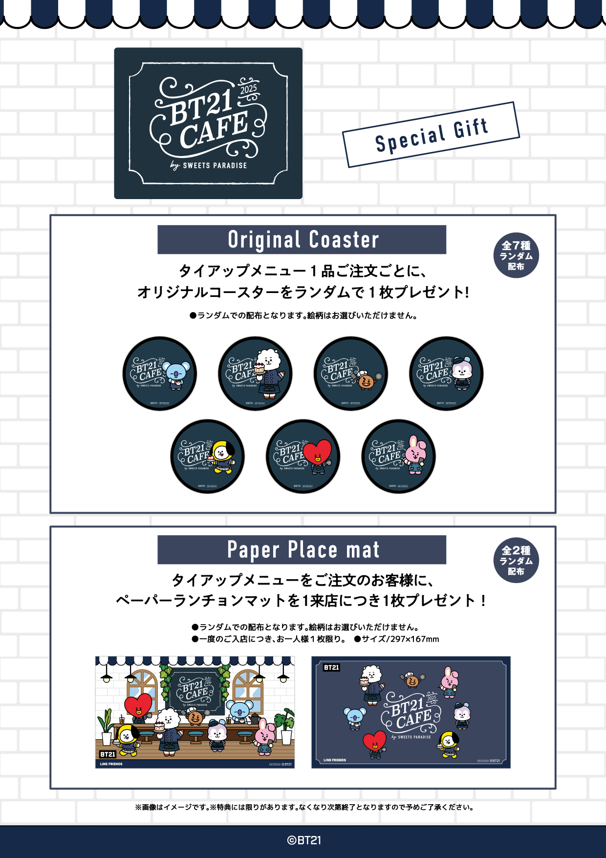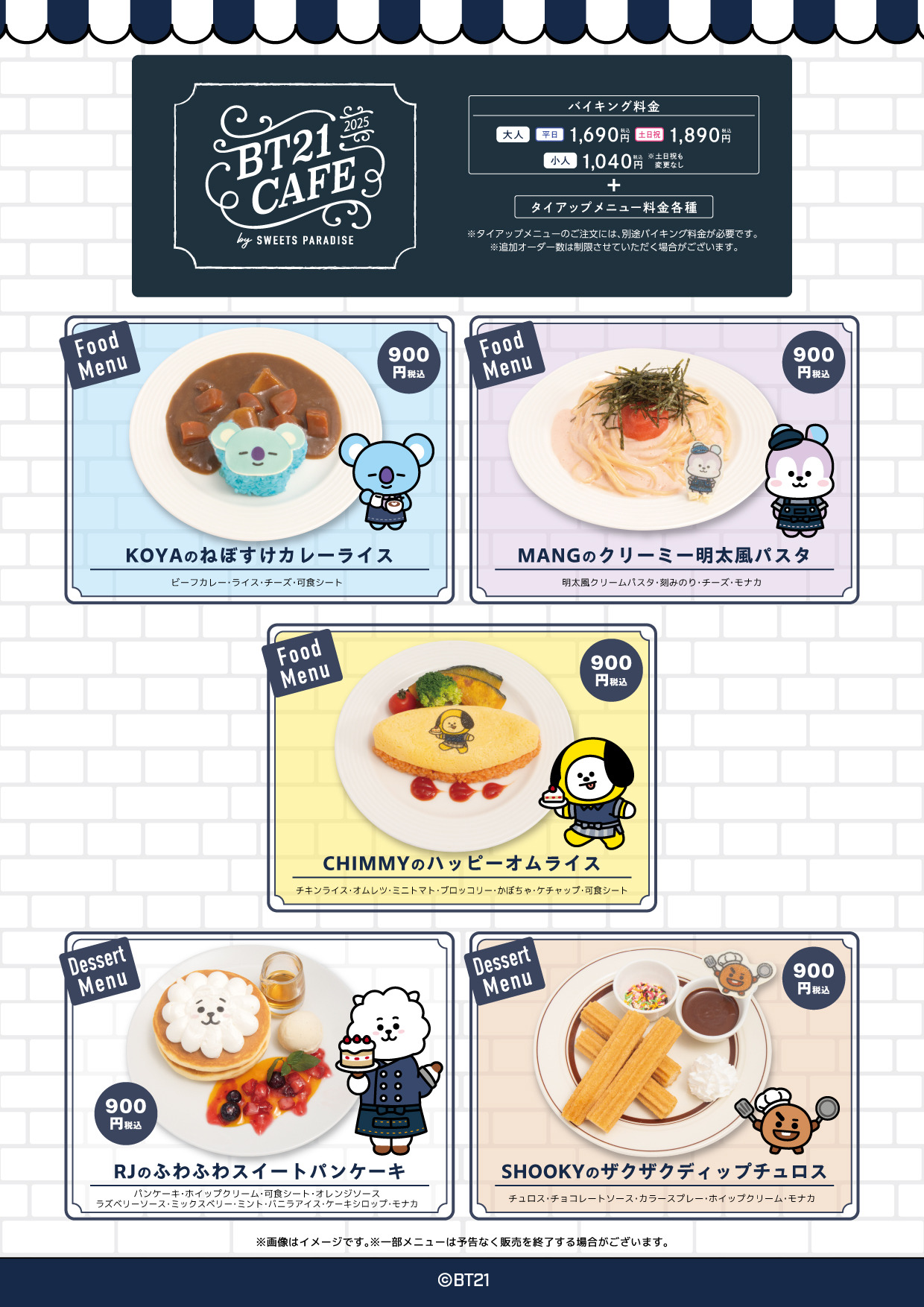今回のタイアップカフェのためだけに描き起こされたBT21のかわいいキャラクターたちのオリジナルメニューやノベルティ、スイーツパラダイス限定グッズなどが楽しめます♪