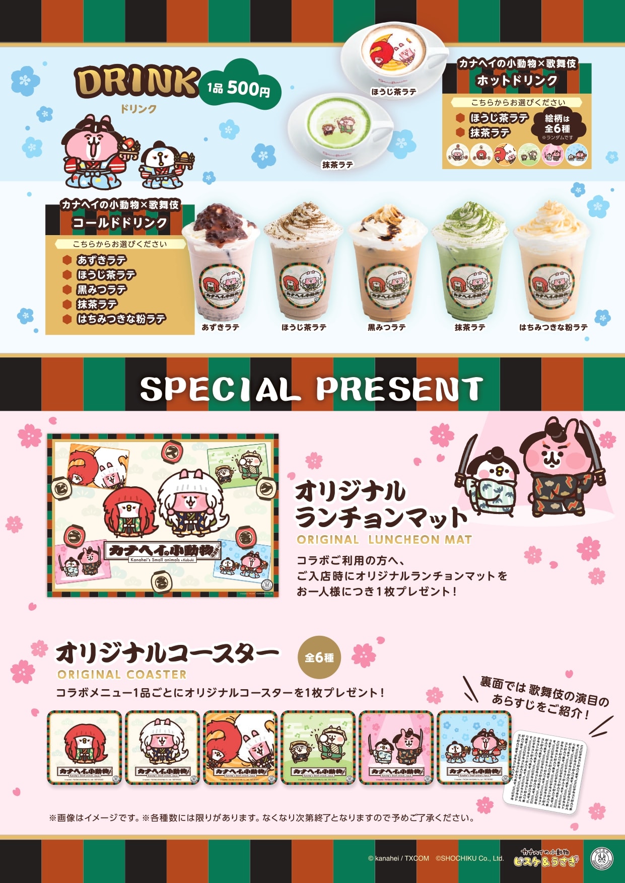 「カナヘイの小動物」と伝統芸能「歌舞伎」をイメージしたコラボメニューやグッズをご用意して皆様のご来店をお待ちしております。