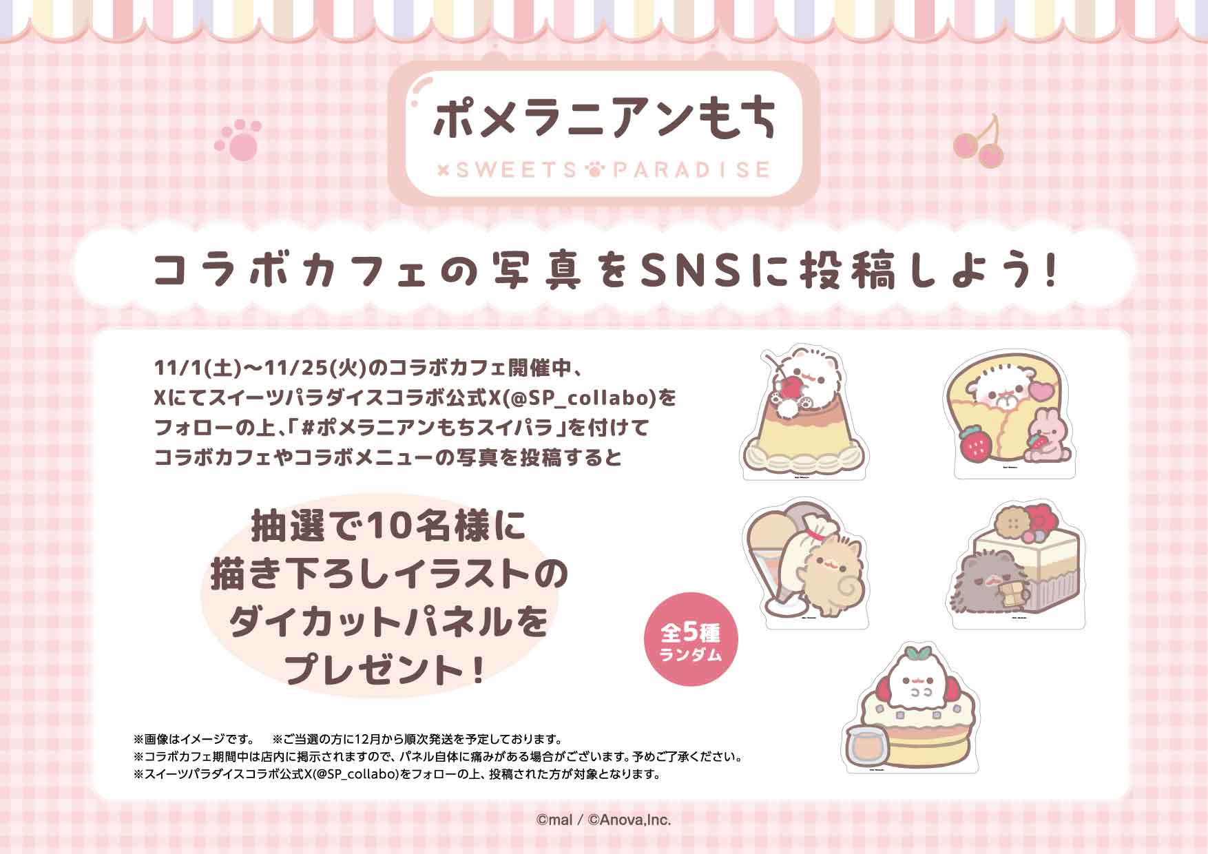 11/1(土)~11/25(火)の期間中、「#ポメラニアンもちスイパラ」を付けて「X」でコラボカフェやコラボメニューの写真を投稿すると抽選で10名様に〈描き下ろしイラストのダイカットパネル〉をプレセント!