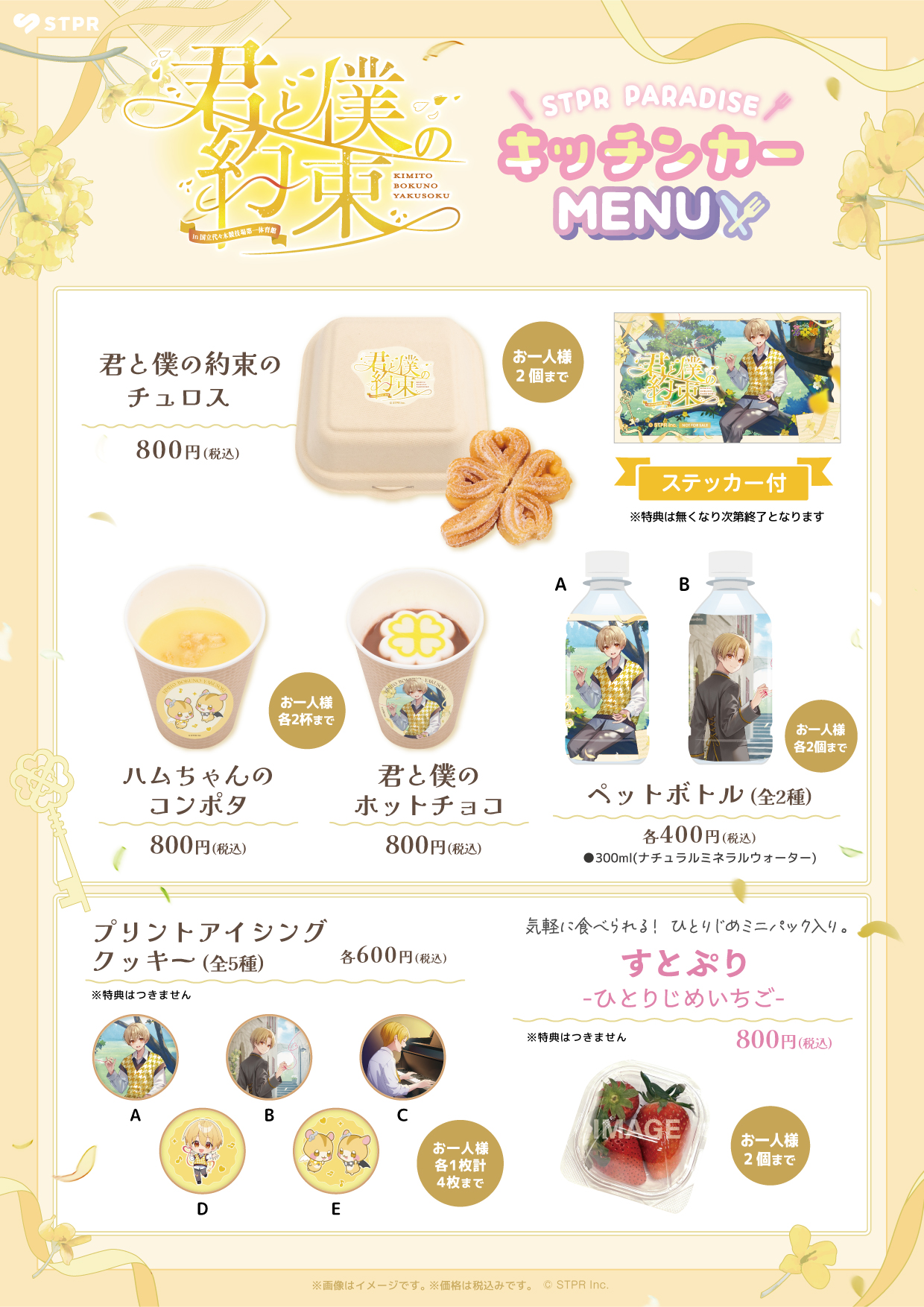 ※お一人様1会計につき、フード2品、ドリンク2杯、プリントアイシングクッキー1種類につき1枚(合計5枚)、すとぷり-ひとりじめいちご-2パックまでの購入制限を設けさせていただきます。
