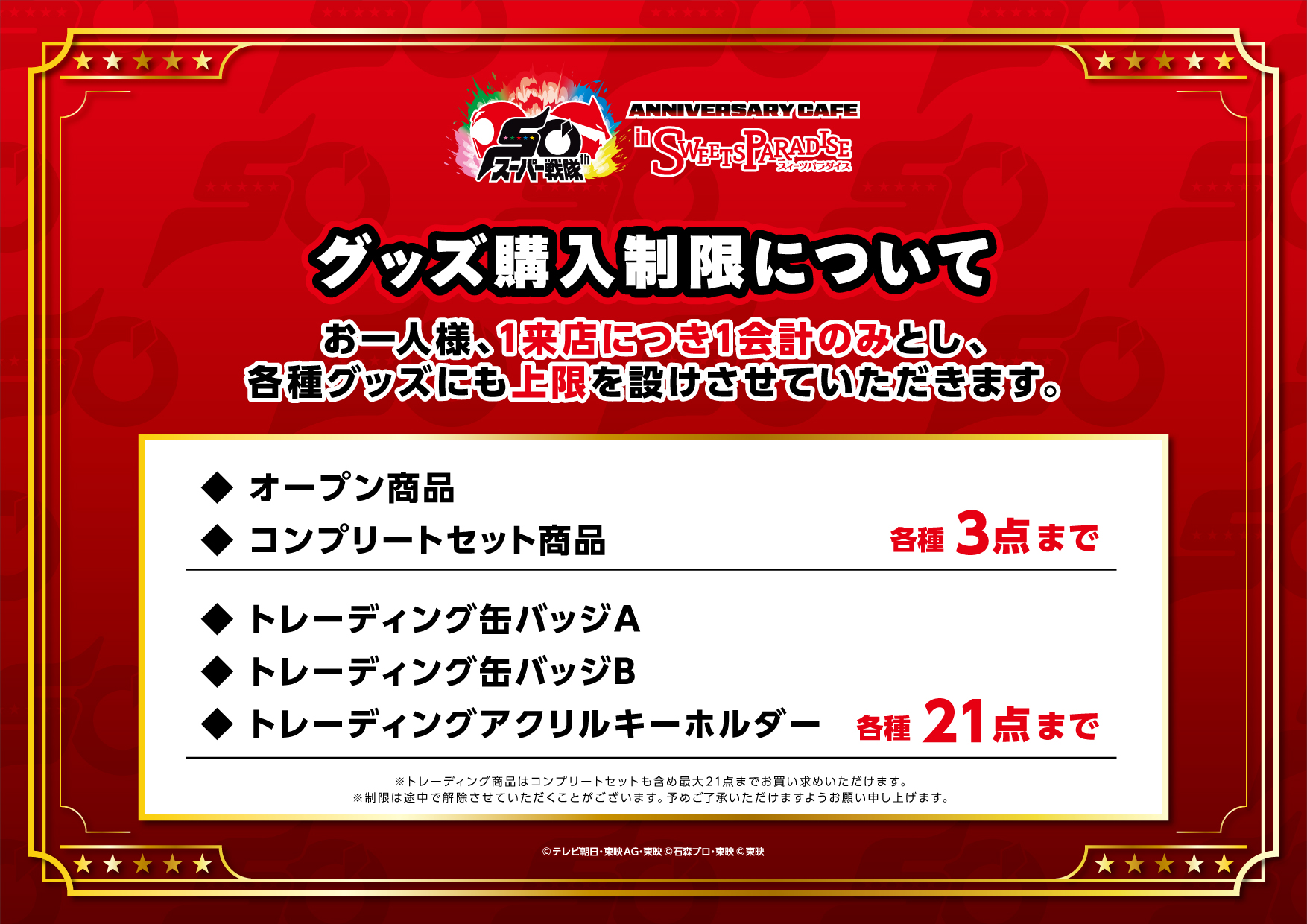 より多くのお客様にご購入いただけるようコラボグッズに購入制限を設けさせていただきます。