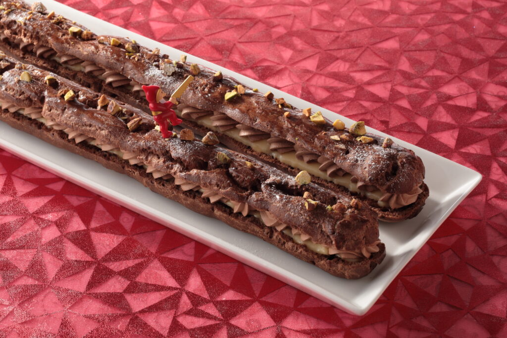 ココアを練り込んだシュー生地に、自家製カスタードとチョコホイップをふんわりとサンドしました。ローストしたピスタチオの香ばしい食感がアクセントになった、満足感のあるココアロングシューです。