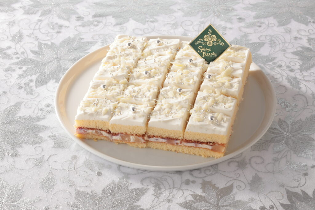 バニラが香るカスタードクリームに洋梨を合わせ、ラズベリーソースとともにスポンジでサンドしました。仕上げにホワイトチョコのクリームで丁寧にコーティングした、上品な甘さが特徴のケーキです。