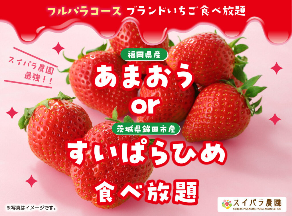 スイパラ農園人気いちご「あまおう」と「すいぱらひめ」のいずれかが食べ放題♪