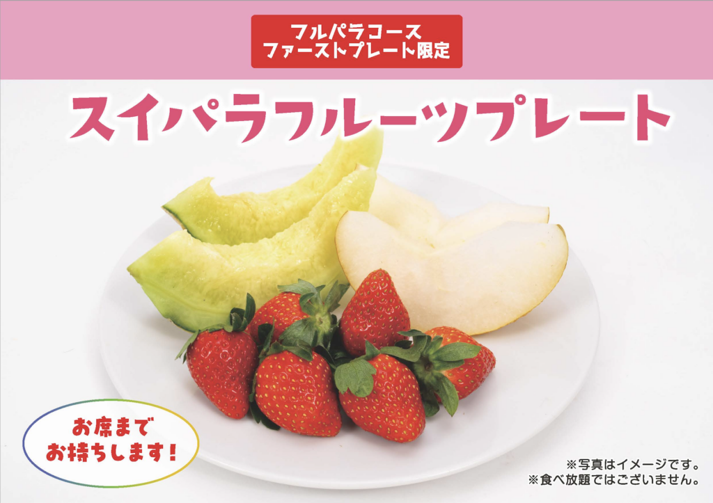さらにファーストプレートとして、ブランドいちごを使用した「スイパラフルーツプレート」をご提供。