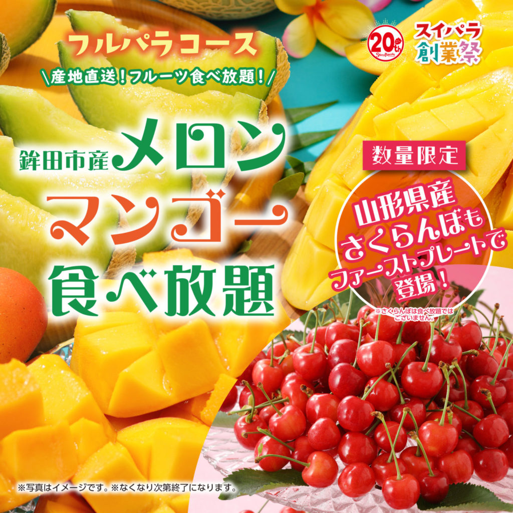 只今フルパラコースでは「山形県産さくらんぼが新登場!鉾田市産メロン&マンゴー食べ放題」を開催しております!